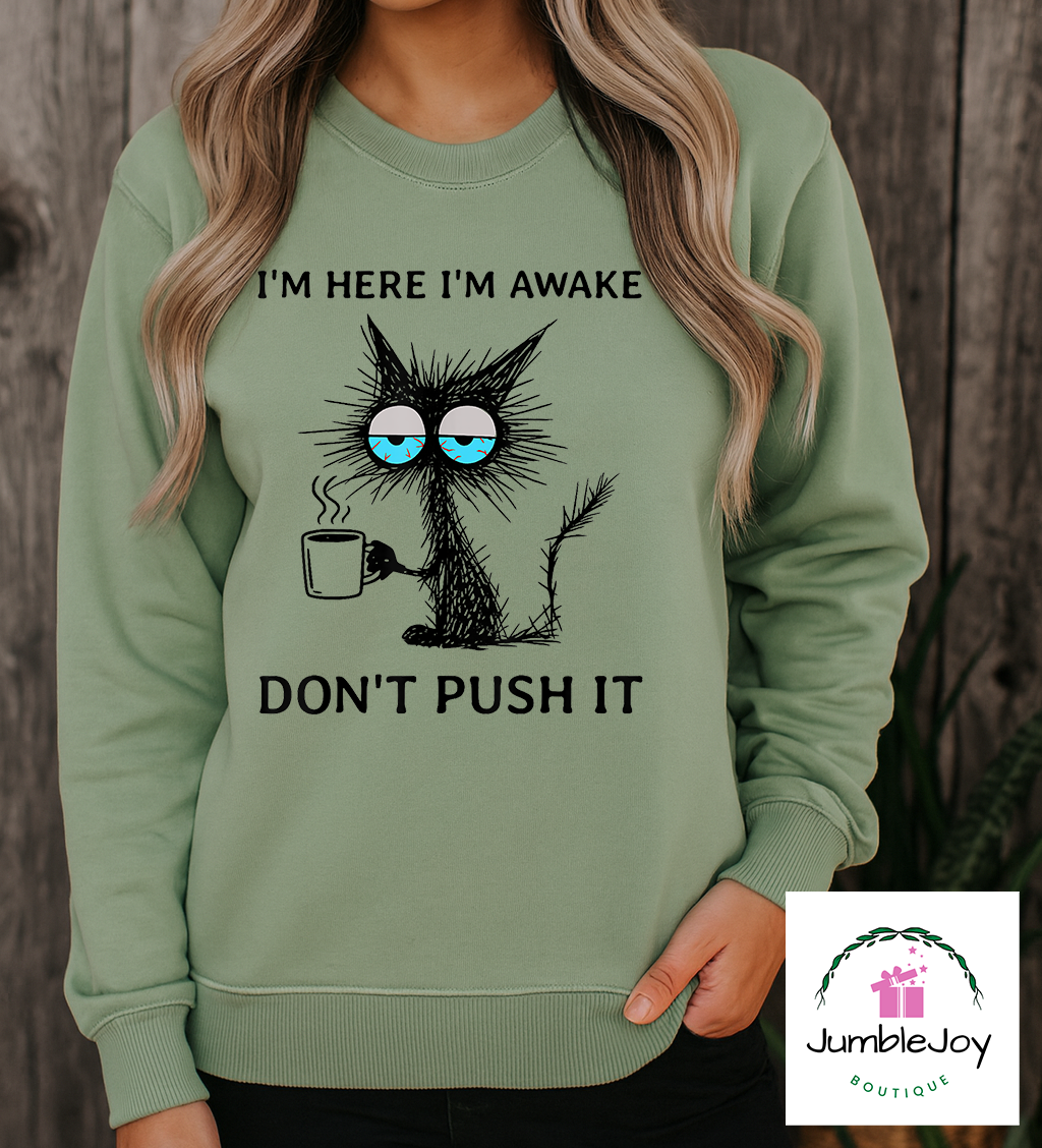 I’m Here I’m Awake Don’t Push It – Sweatshirt Raglan T-Shirt Tee Cat Coffee