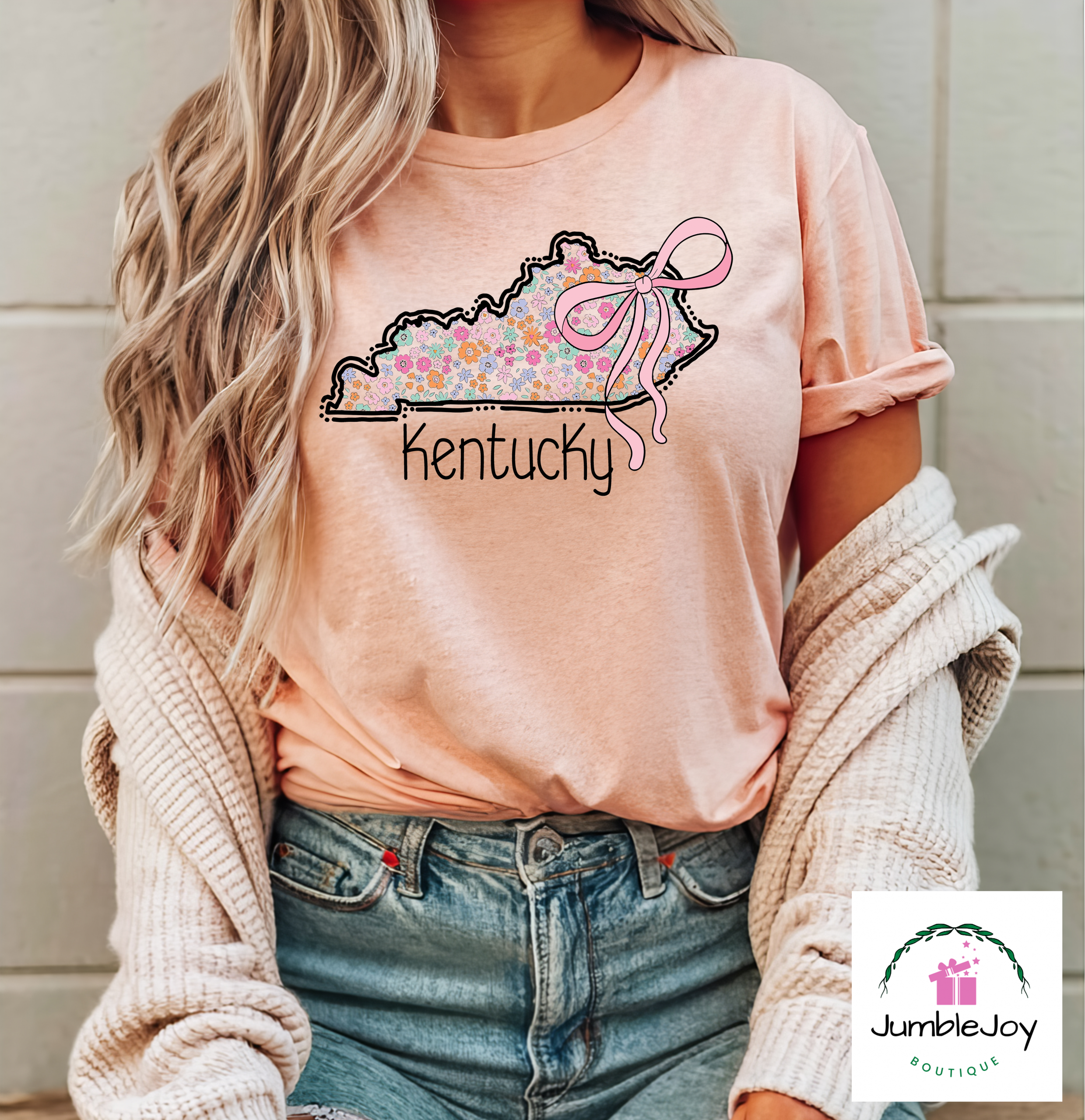 Kentucky State Outline Floral Pink Bow T-Shirt Tee
