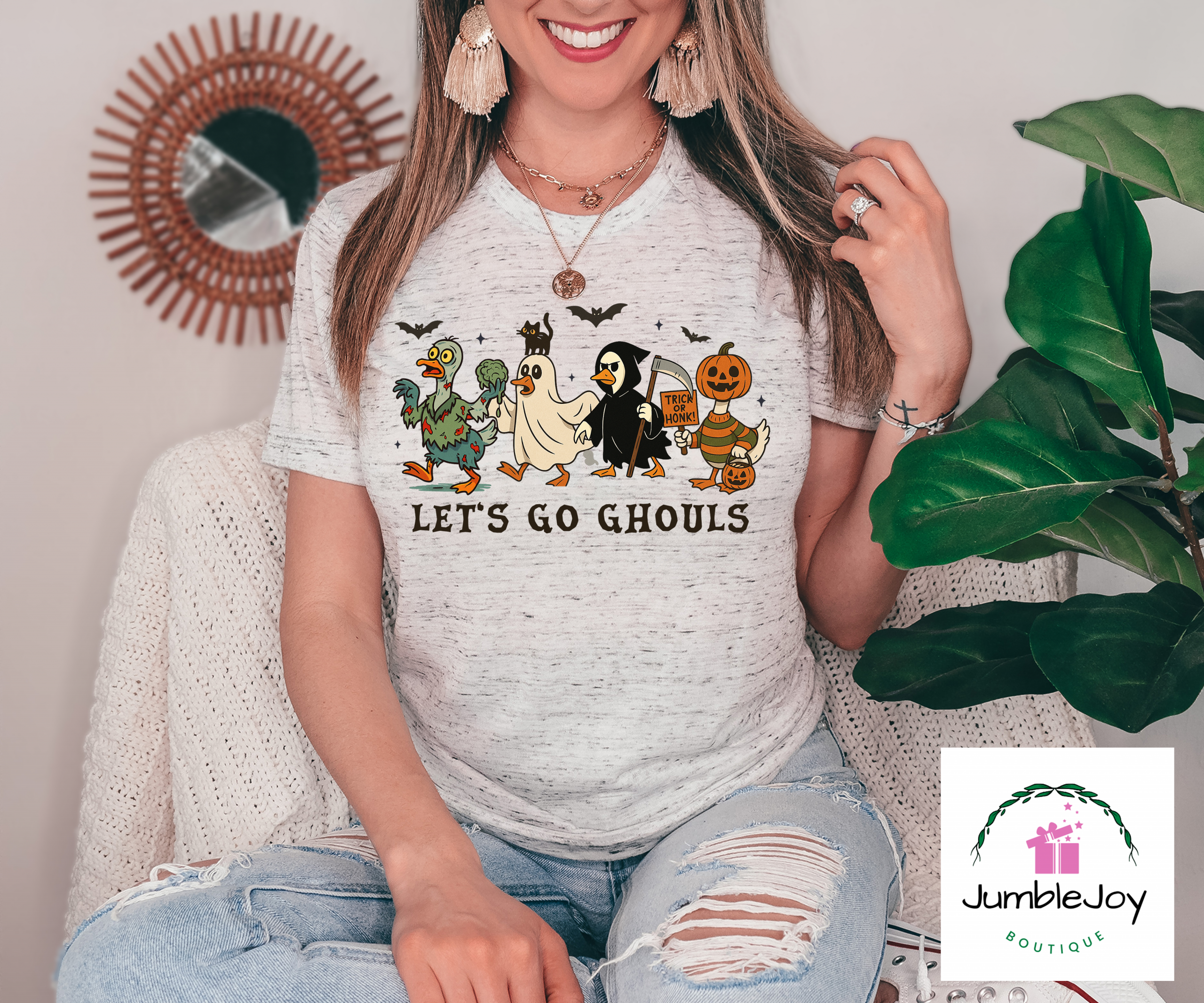 Let’s Go Ghouls T-Shirt Tee Raglan Halloween Trick or Treat Geese in Costumes Goose